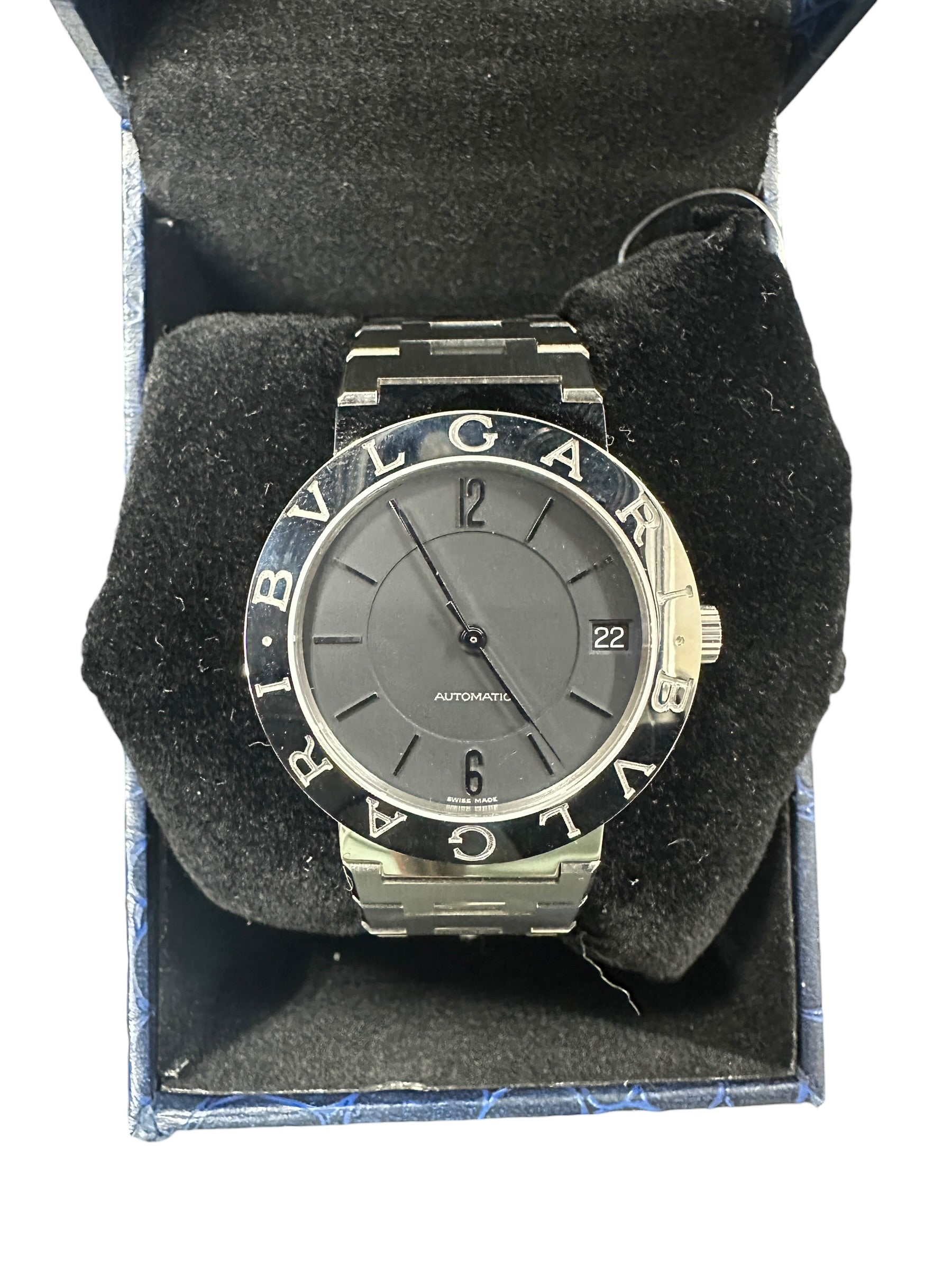 A timeless classic, this BVLGARI BVLGARI model features a minimalist black dial that offers a bold contrast against the polished stainless steel case and bezel.