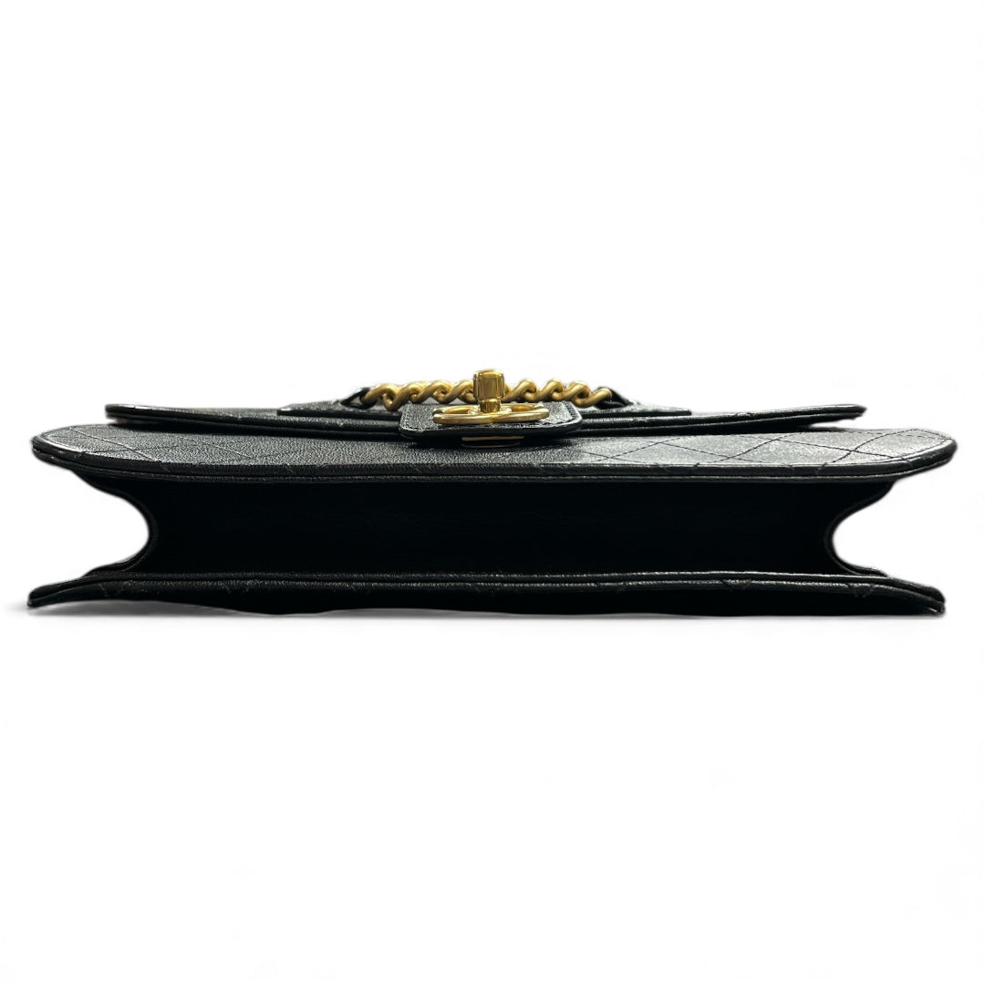 Black leather shoulder bag with quilted design and gold chain.