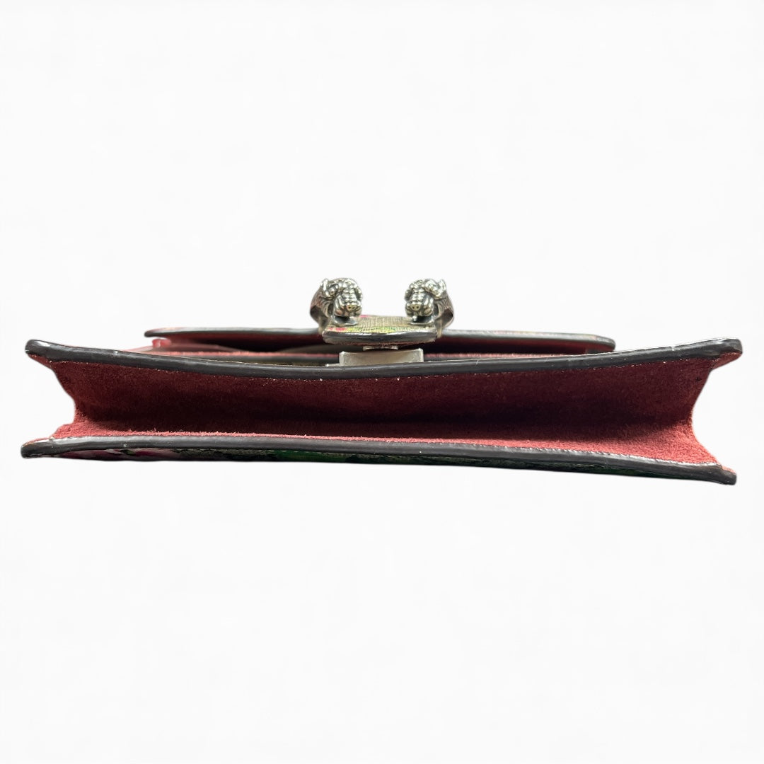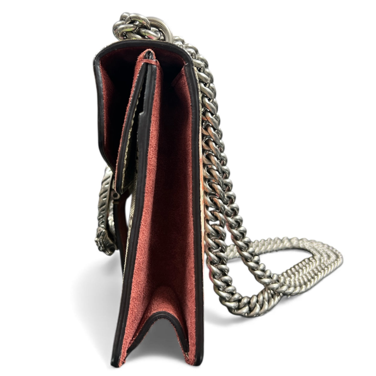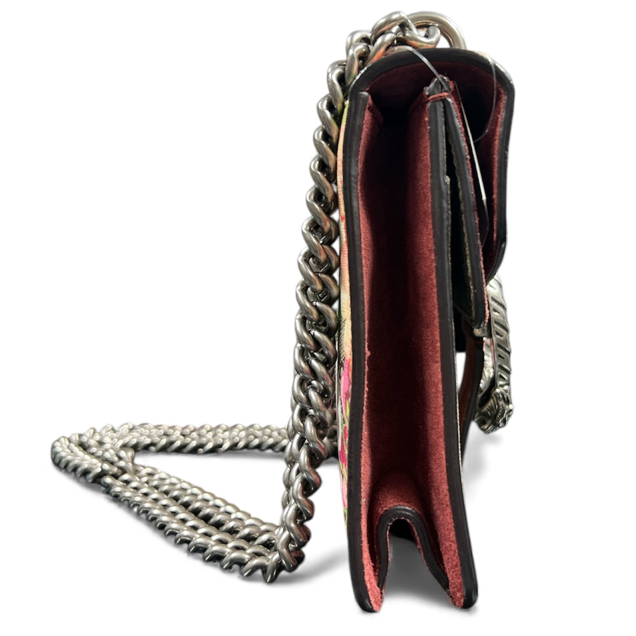 This Gucci shoulder bag features a floral print and a stylish chain strap.