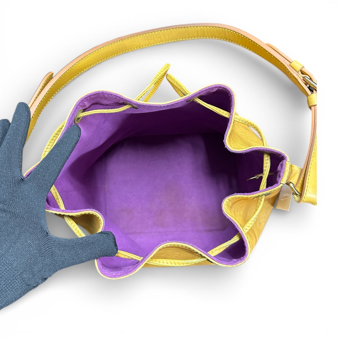 Yellow bucket-shaped shoulder bag made of Epi leather, with a stylish purple interior.