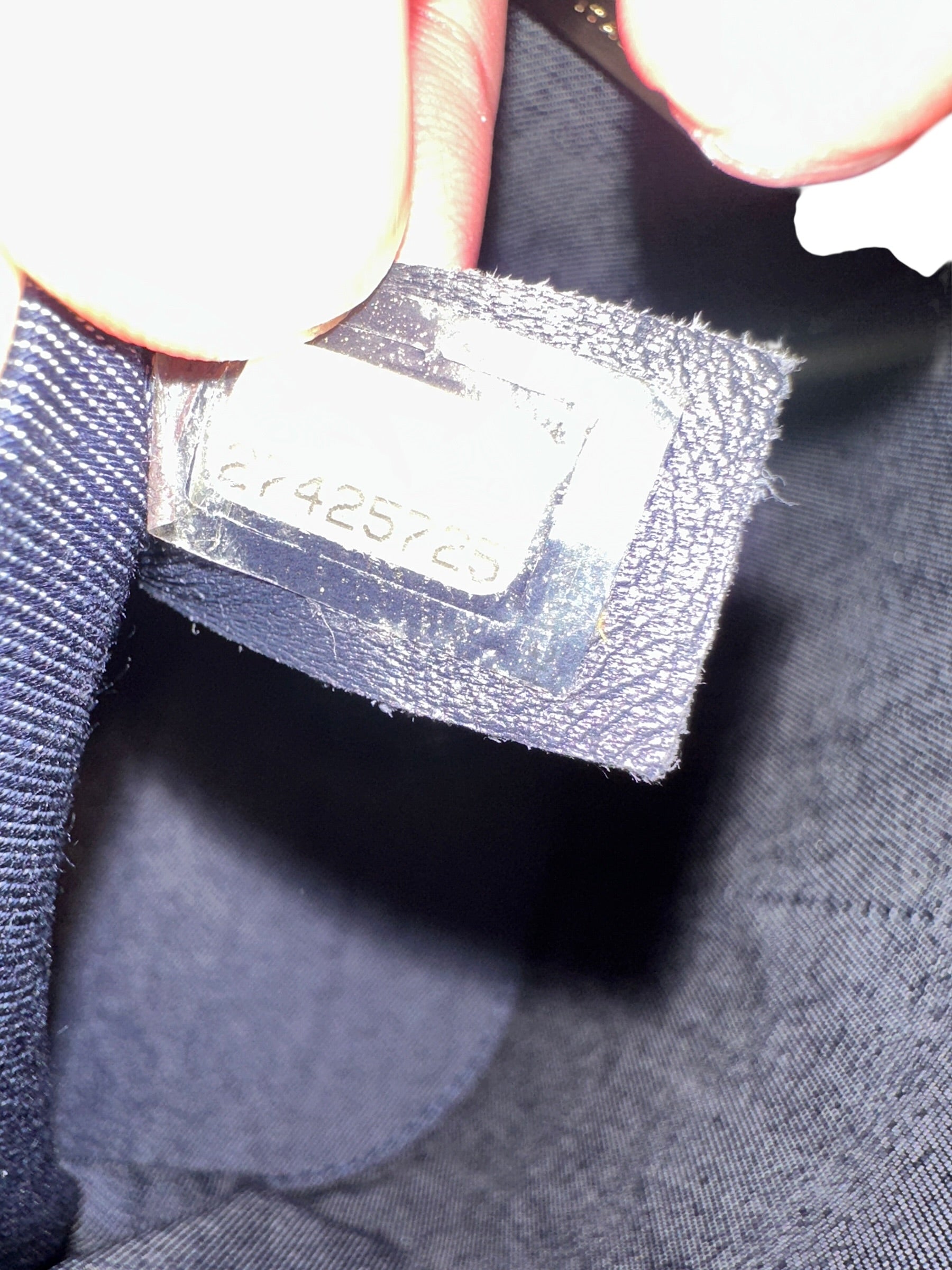 Blue textile (denim-effect) interior lining with a gold Chanel nameplate